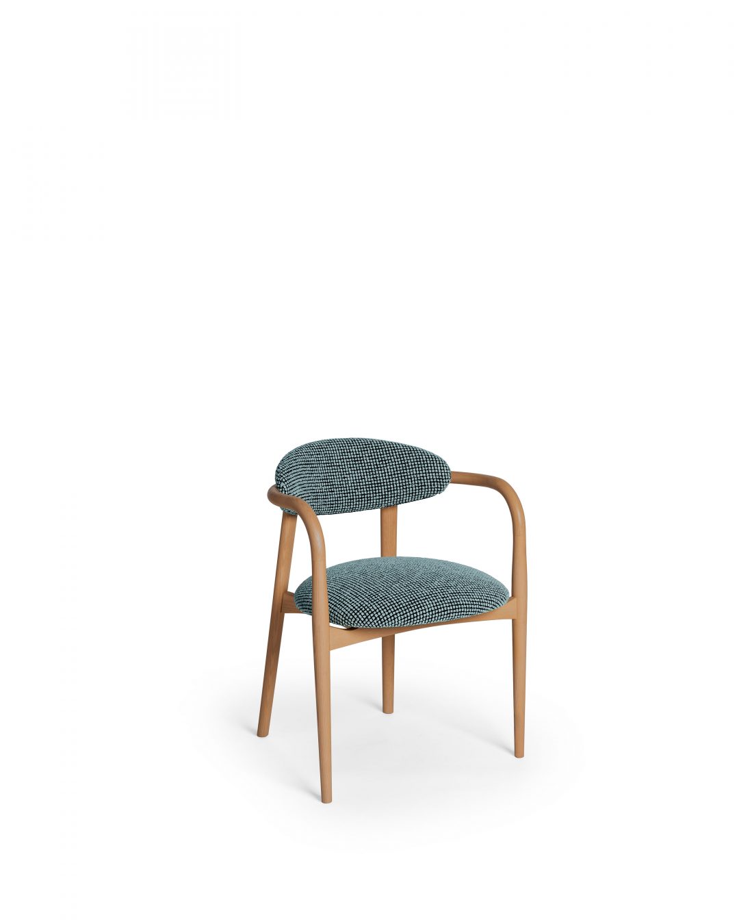 Sedia con braccioli. Schienale e sedile imbottiti. Struttura in legno massello di frassino.