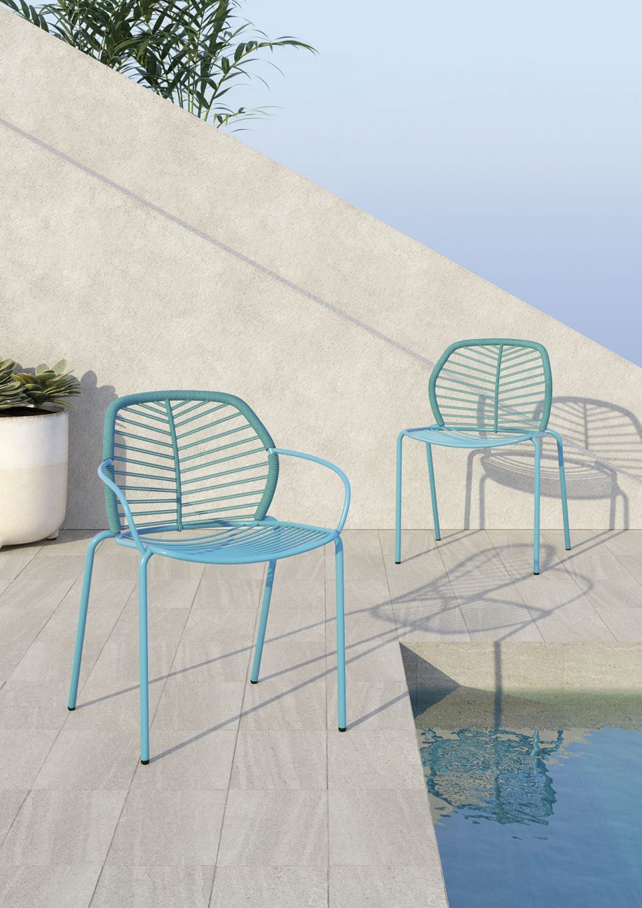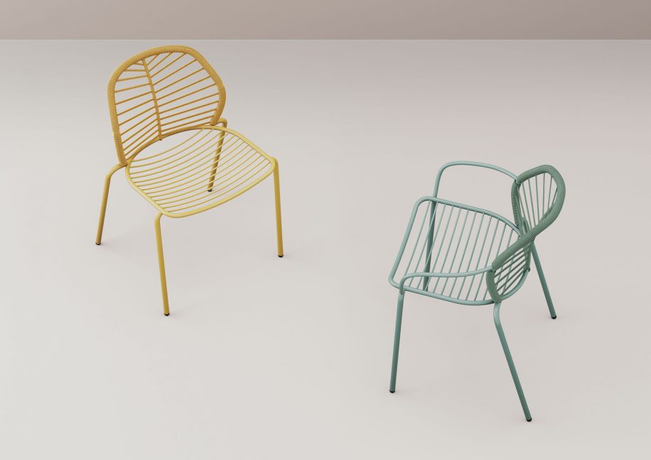 Struttura in tubo metallico verniciato e schienale intrecciato a mano con corda nautica.