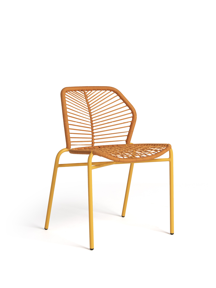 Nello schienale, le stringhe sono lavorate a diversa tensione. Irradiandosi da una nervatura centrale, dello stesso materiale, imprimono una curvatura che rende la seduta estremamente confortevole e resistente.