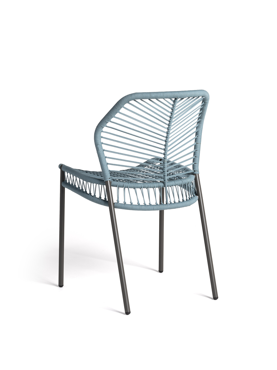 Nello schienale, le stringhe sono lavorate a diversa tensione. Irradiandosi da una nervatura centrale, dello stesso materiale, imprimono una curvatura che rende la seduta estremamente confortevole e resistente.