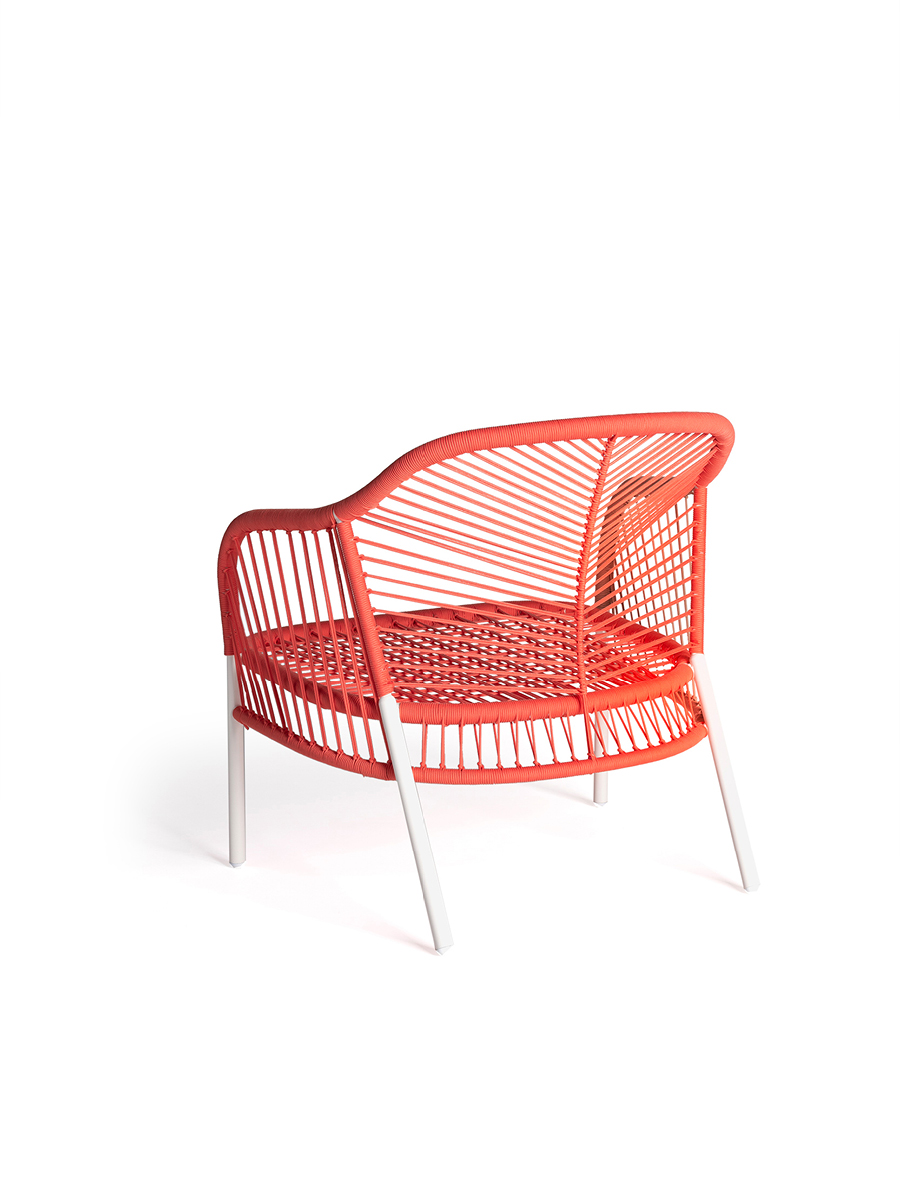 Nello schienale, le stringhe sono lavorate a diversa tensione. Irradiandosi da una nervatura centrale, dello stesso materiale, imprimono una curvatura che rende la seduta estremamente confortevole e resistente.