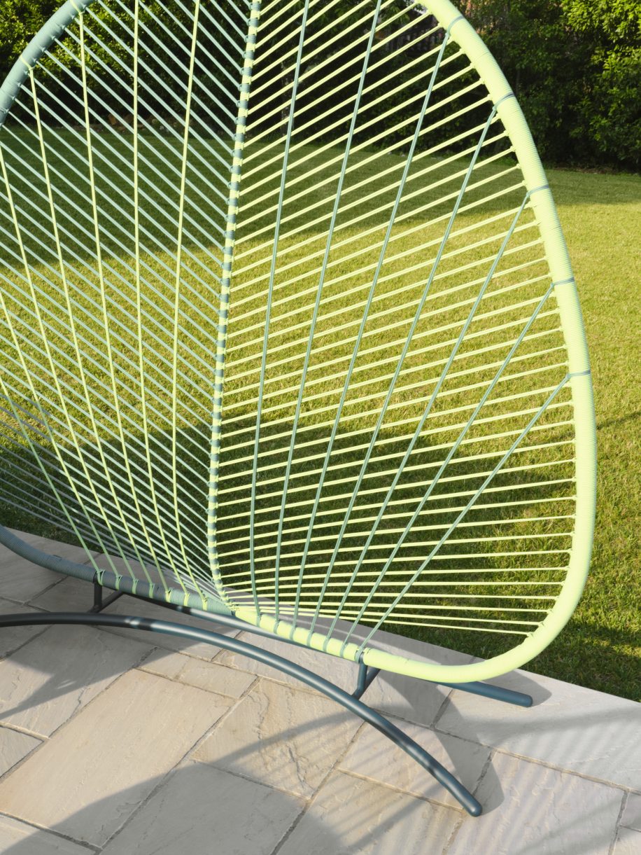 Struttura in tubo metallico verniciato e intrecciato a mano con corda nautica.