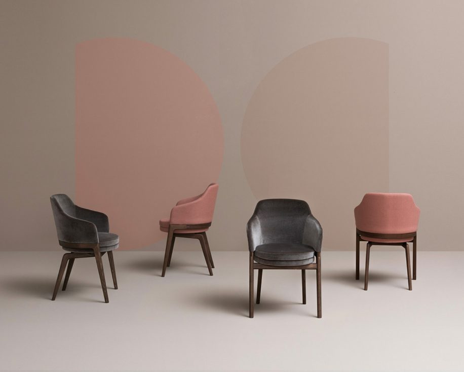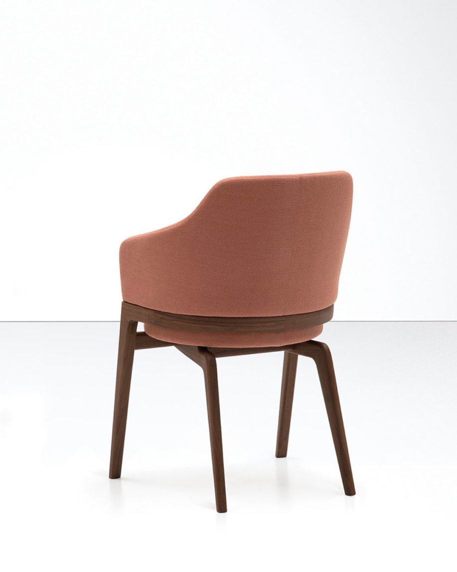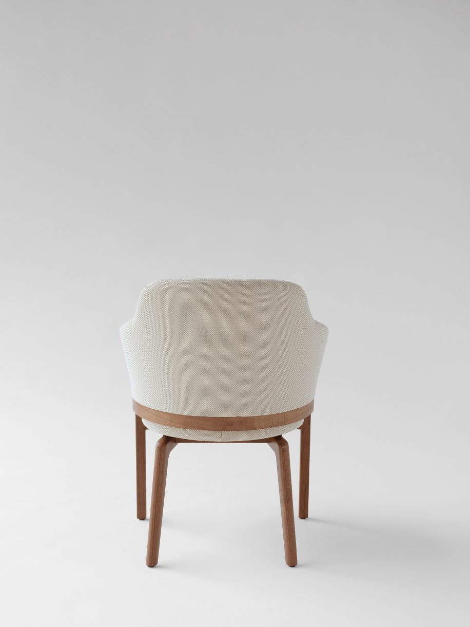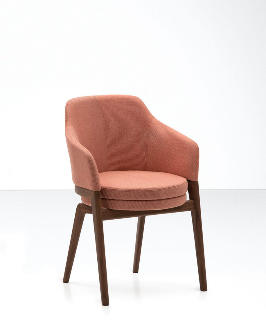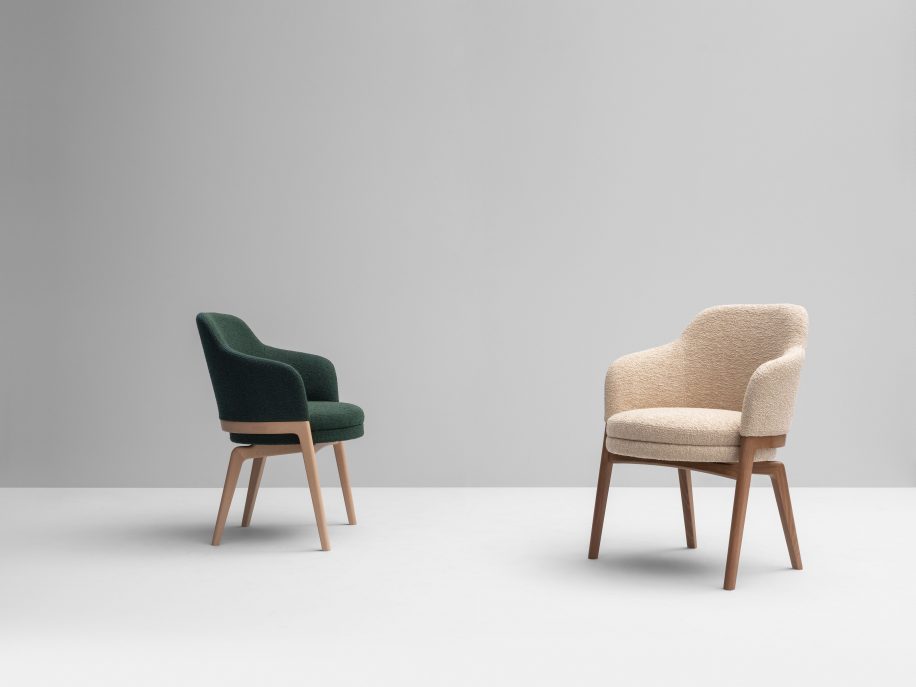 Poltroncina con schienale avvolgente. Imbottitura sagomata.