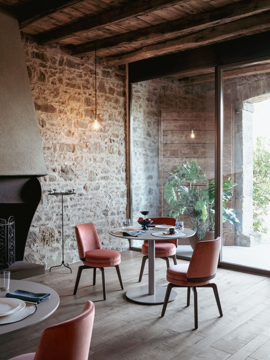 Sedia. Seduta e schienale imbottito. Legno massello. Disponibile anche nella versione girevole.