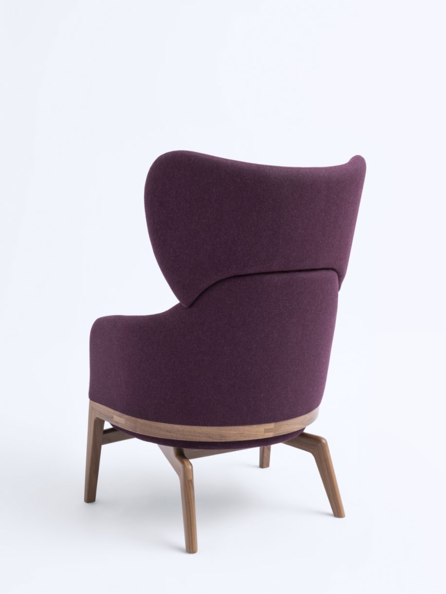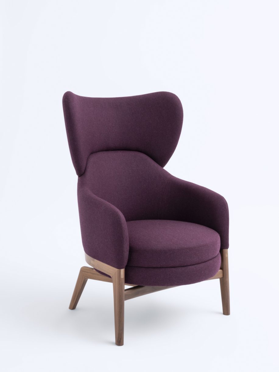 Macaron bergère displays all the features of a product developed for the contract sector: the comfort of a high enveloping backrest, characterized by a large headrest that creates an intimacy space; a soft two-layer padded seat, a perfect circle that inspires relaxation and recalls the profile of the French pastry the collection was named after; the solidity of the solid wood structure and, of course, extreme versatility in furnishing any environment. A curved wooden profile encircles the base of the body, finishing in the front legs. The profile characterizes the aesthetic of the entire seat by exhibiting a refined and contemporary trait.