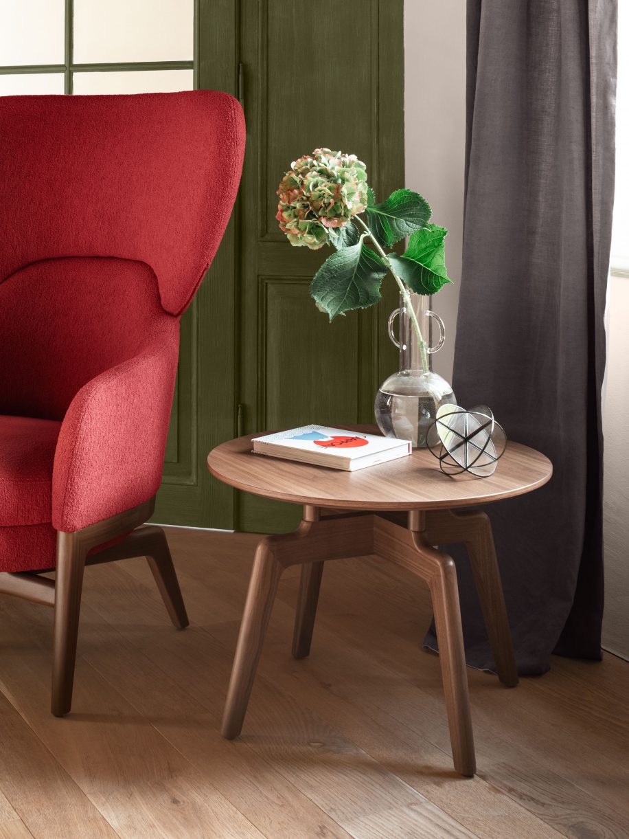 Coffee Table. Base in solid wood, top formed by three combined elements.
