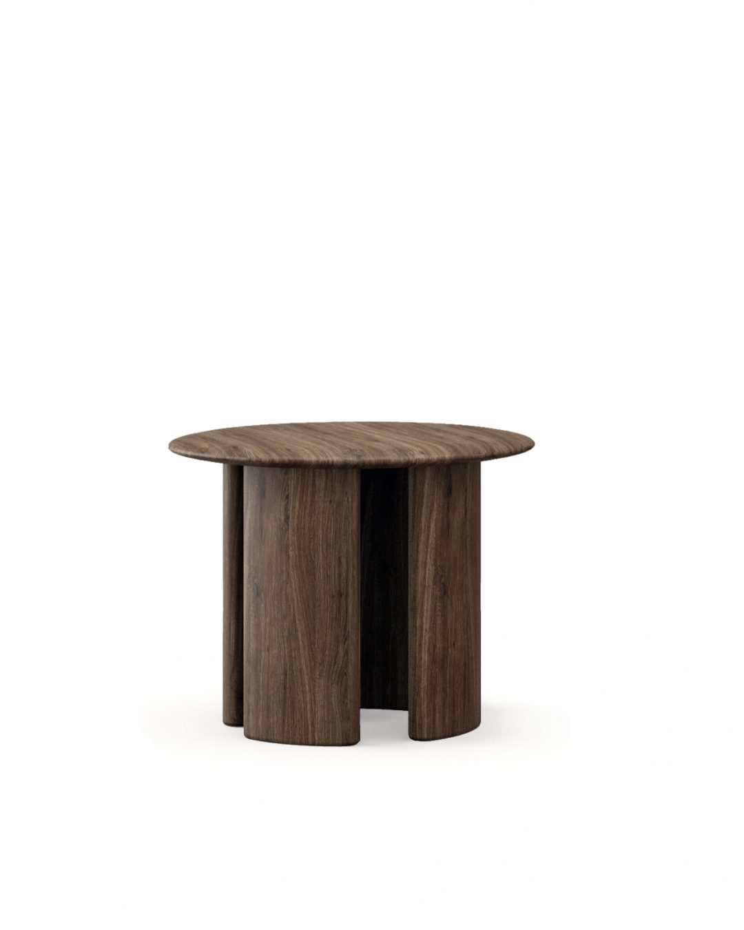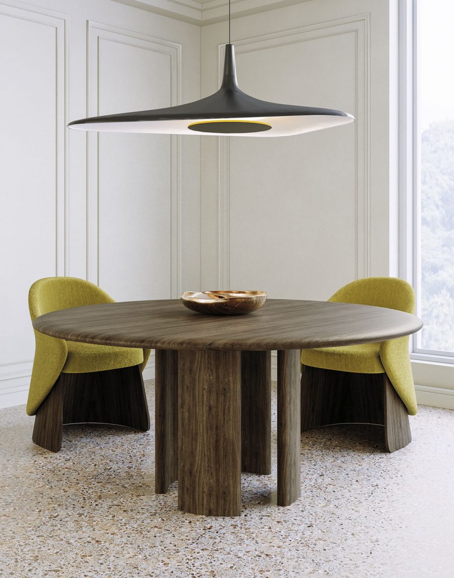 The design of this table is inspired by an ideal harmony between functionality and style, combining the artisanal tradition of wood with a contemporary and refined vision. The round structure of the tabletop, simple and harmonious, encourages dialogue and conviviality, giving the table a sense of openness and welcome. The legs, composed of four sections of milled and curved wood, are arranged in a semicircle, forming a cylindrical silhouette that is enveloping yet simultaneously enhances the lightness of the design.
